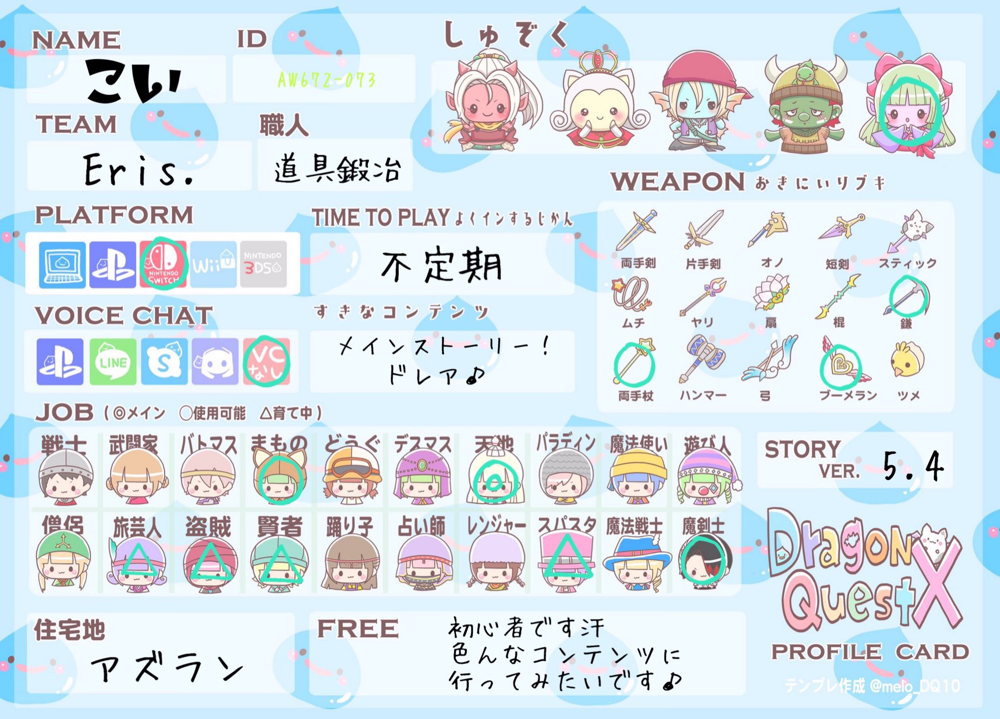 こい 可愛いプロフィールカードを 見つけたので書いてみました Dqx ドラゴンクエストx ドラゴンクエスト10 ドラクエ10フレンド募集 ドラクエ10初心者 ドラクエ10フォロワー募集 Dqx自己紹介カード T Co Arjvfax7gf Twitter